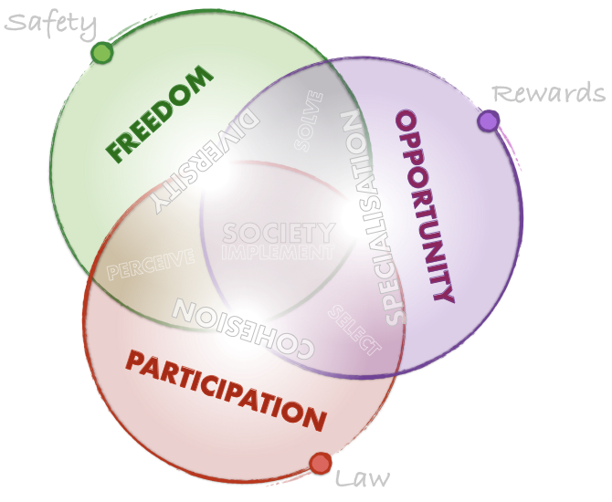 In the space where two Realms overlap the Qualities of the two overlapping Realms create the special conditions in which one of the Elements is enabled. Where Safety and Law protect the space the conditions for sharing Perceptions arises. Where Safety and Rewards carve out a space that is where Solutions are developed and innovation occurs. Where Rewards and Law create a space the Selection of solutions is practiced. And where Safety, Law and Rewards all defend a central space the capacity of the society to Implement is defined. To see more accurately, solve more inventively, select more wisely, and implement more completely are the true purposes of social life, and it is by creating the spaces within which those Elemental practices can be maximised that the true purpose of the Realms and their defining Qualities is revealed.